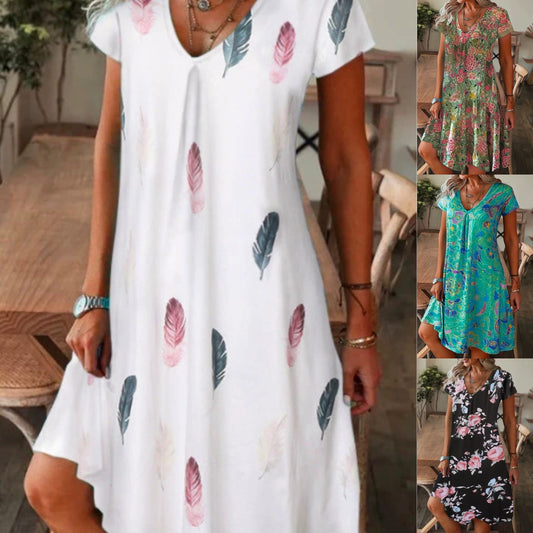 💕【S-5XL】Rochie lejeră de vară cu imprimeu larg, cu decolteu în V și mâneci scurte